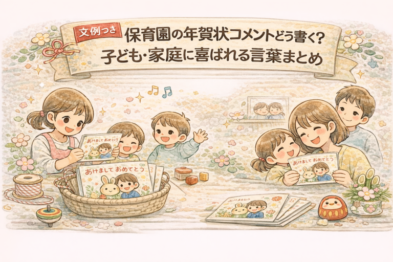 年末が近づくと、保育園では「年賀状のコメント、何を書けばいい?」と悩む保育士さんも多いのではないでしょうか。 保育園の年賀状は、単なる新年の挨拶ではなく、子どもたちや保護者とのつながりを感じてもらう大切なツールです。一方で、形式ばりすぎると冷たい印象になったり、配慮が足りない表現が負担になってしまうこともあります。 この記事では、 子どもに向けた年賀状コメント 保護者・家庭に向けたコメント クラス […]
