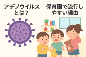 これらが重なることで、アデノウイルスは保育園の集団生活において特に流行しやすくなります。
