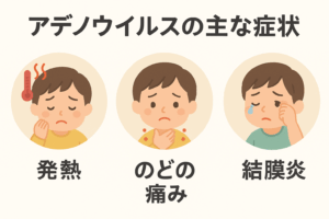 「プール熱(咽頭結膜熱)」「流行性角結膜炎」「胃腸炎」など、さまざまな症状を引き起こすのが特徴で、同じアデノでも“型”が違うと症状が大きく異なります。