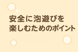 泡が目に入るとしみることがあり、小さな子は驚いて泣いてしまうことも。顔の近くで泡を扱わない、頭の上に泡をのせる遊びは避けるなど、大人が意識してコントロールしましょう。また、泡を口に入れてしまう子もいるため、初めて遊ぶときは特に見守りをしっかり行います。