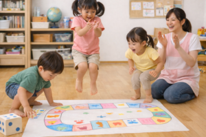 幼児クラスで特に盛り上がるのが、体を動かすミッション入りのすごろくです。「くまさん歩き」「手をたたく」「ジャンプする」など、簡単な動作を取り入れることで、室内遊びでも体をしっかり動かせます。