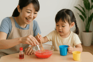 「まぜまぜ」「どんな色になるかな?」という言葉を交わしながら、科学的な興味や観察力を育てることができます。