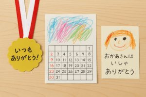 子どもが「お母さんは○○のおしごと」「○○してくれてありがとう」と一言書き添えるだけでも立派な作品。