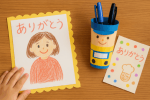 「おしごと、いつもありがとう」「○○をしてくれてうれしい」など、短い言葉でも子どもなりの思いがこもります。