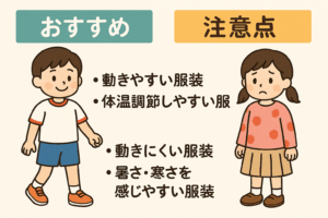 また、服に余分な装飾や長すぎるひもなどが付いていると、転倒やケガの原因になる可能性があります。シンプルかつ機能的なデザインを選ぶことが大切です。
