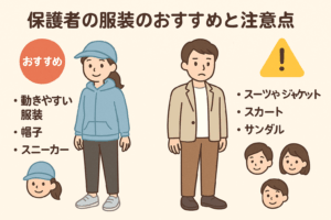 子どもも保護者も、スカートやワイドパンツ、サンダルなどは動きにくく、転倒やケガの原因になりやすいです。また、アクセサリーやフード付きのトップスも危険を伴うため避けましょう。