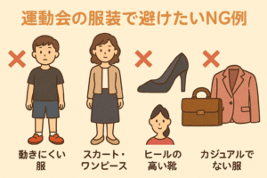 競技に参加する保護者:走ったり抱っこしたりする場面もあるため、伸縮性のあるパンツや速乾性のトップスを選びましょう。靴はスニーカー一択で、サンダルやヒールは厳禁です。
