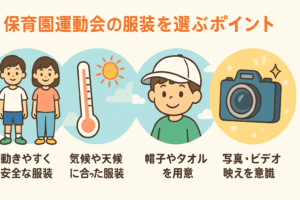 保育園の運動会は、子どもたちの成長を感じられる特別な行事です。適切な服装を選ぶことで、子どもはのびのびと競技に集中でき、保護者も安心して応援や参加ができます。服装は快適さだけでなく、安全性や場の雰囲気に合うことも大切です。