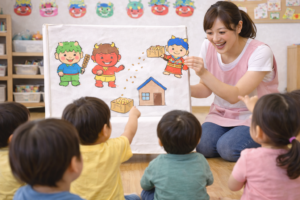 視覚的に分かりやすいパネルシアターやペープサートは、保育園の節分出し物として定番です。